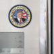 Elegante y elegante diseño de focas redondas con una foto del presidente Donald Trump, sonriendo con un borde de estrellas. El texto alrededor del perímetro dice el presidente Donald J. Trump, ¡mantengan a Estados Unidos grande! con el año 2020. Bandera patriótica estadounidense de fondo, este producto hace un regalo ideal para Navidades para un esposo, novio, padre, esposa o cualquier persona que apoye a Trump. Celebra la toma de mando o la campaña de reelección con este hermoso regalo de colección de objetos memorables.