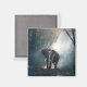 Un imán con una fotografía de un elefante asiático con orejas redondeadas en un bosque despejado mirando hacia el espectador con la luz del sol cayendo por el dosel arbóreo.