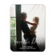 Esta moderna foto de guión guarda el imán de fecha que contiene una foto de sangrado completa con un guión que guarda la fecha sobre sus nombres, fecha y lugar en texto blanco. Diseñado por Thisisnotme©