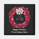 Una elegante corona en tonos rojos con adornos blancos y un gran arco blanco de vacaciones. Personalizar con el nombre de su familia para un buen regalo de vacaciones.