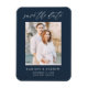 Anuncia tus próximas nupcias con este imán elegante de guion de foto para guardar la fecha. “Save the Date” se muestra en un guion moderno de caligrafía blanca sobre tu foto de compromiso en un fondo azul marino. Personaliza este diseño atemporal con tus nombres, fecha de la boda y ubicación. Un hermoso recuerdo para que los invitados lo muestren en su refrigerador como un recordatorio de tu día especial.