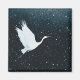 Graciosamente, la grúa blanca minimalista se eleva a través de una tormenta de nieve en invierno.