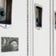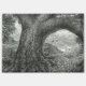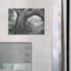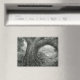 A detailed charcoal drawing by Amanda Diehl features a large, old tree growing bent over the edge of a cliff in the foreground. The tree's trunk and roots are prominently displayed, with intricate textures and patterns. Through a natural arch formed by the tree's branches, a landscape with hills, vegetation, and a cloudy sky is visible. Several birds are flying in the distance.