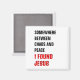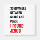 Elegante imán cristiano minimalista con texto inspirador leyendo EN ALGÚN LUGAR ENTRE EL CAOS Y LA PAZ ENCONTRÉ JESÚS en tipografía negrita negra y roja, regalos coincidentes disponibles.