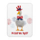Este divertido imán patriótico cristiano festivo tiene un pato de piel blanca con un tío Sam gorra y una corbata de arco de la bandera de Estados Unidos. Las palabras "En Dios confiamos" están en una fuente divertida y de moda y pueden cambiarse para copiar su elección.