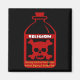Botella con cráneo y huesos cruzados dice "Religión" y debajo de "advertencia: el uso habitual causa odio, intolerancia y guerra interminable".
