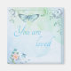Un fondo de color azul pastel con una sola mariposa azul, una franja floral y una sola flor rosada con la frase personalizable "Eres amado" en letras azules grandes.