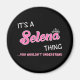 Es algo de Selena que no entenderías - tipografía de primer nombre con letras de letras mezcladas en blanco y rosa. El nombre rosado en el tipo de letra decorativa está enmarcado en blanco y coronado con una corona blanca.