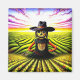 A.I. creó la impresión de un espantapájaros vestido con un traje parado en medio de frondosos campos de verduras bajo una vibrante puesta de sol. El paisaje se extiende a lo lejos con hileras de cultivos y un cielo colorido lleno de nubes