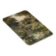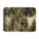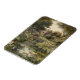 pintura vintage de una escena botánica de cisnes nadando en el agua en un jardín inglés con nenúfares, puentes y muchas flores exóticas