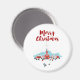Un imán con una imagen digital de un ilustracion pintado de una iglesia y un campanario rojos. Una estrella Navidad brillante brilla sobre su cabeza. Familias que llegan al exterior para un servicio de iglesia. La nieve de invierno cubre el suelo y descansa sobre bonitos pinos arbolados. Feliz Navidad escrito con un estilo de moda rojo.