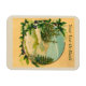 Una imagen rústica vintage; una viñeta circular con montañas y árboles de coníferas con nieve en las ramas rodeadas por un motivo floral. Añade tu propio texto.
