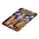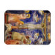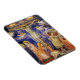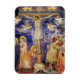 Escena medieval del Viernes Santo con Cristo en la Cruz rodeado de ángeles. Richalmente coloreado en azul, amarillo dorado y naranja.