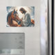 Una representación pacífica de Jesús que se conecta tenazmente con un caballo en un entorno celeste, simbolizando armonía, confianza y conexión espiritual en medio de una atmósfera divina y serena.