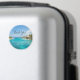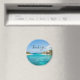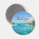 Un imán de agradecimiento con una hermosa foto que muestra un resort de playa tropical. agua azul bonito y playa de arena blanca con cabañas de paja que le confieren un ambiente tranquilo a la isla.