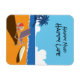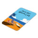 Escena de playa con Surfer, silla y naranja brillante y azul como los colores dominantes. La escena está diseñada como una mirada a la época de los años 70. Qué luminosa y colorida escena de la playa en una bolsa de té impresa. El dicho "Happy Mind, Happy Life" es completamente personalizable y puede cambiarse a cualquier cosa que quieras o elimines juntos. Un imán de buen tamaño para llenar un espacio vacío en un archivador metalizado o colgar el refrigerador.