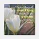 Fotografía suave de tulipanes blancos y amarillos con proverbios 31:25, Ella está vestida con fuerza y dignidad.