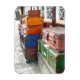Un diseño acuático sencillo de una estación de tren durante la guerra. Maletas apiladas en la plataforma esperando que el tren de vapor las transporte a su destino. Inglaterra.