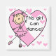 Una adorable bailarina con una figura de palo en un tutu rosado, corazones rosados y un texto que dice "¡Este chica puede bailar!" en bolsos de bailarina, camisetas, caramelos, tazas, botones, tabernas, cadenas, imanes y otras prendas de baile y regalos.