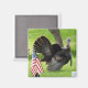El patriota turco con sus plumas de cola delante de una bandera estadounidense