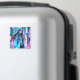 Estrella futurista de anime se encuentra en el centro de una ciudad de cyberpunk. Usa una chaqueta azul claro de gran tamaño y alta tecnología con patrones geométricos audaces, gafas de sol rosas y accesorios futuristas. Diseño perfecto para los adolescentes