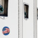Estrellas estadounidenses y bandera de rayas ondeando en el viento.