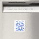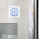 Un Fleur de lis único con una corona y viñas en un diseño de fibra azul abstracto en un imán de cocina.