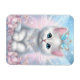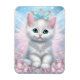 Un adorable gatito blanco de princesa de hadas con joyas, flores rosas y alas de hadas sobre un fondo azul brillante.