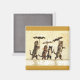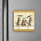 Este imán cuadrado tiene una familia de gatos de dos gatos adultos marrones y dos gatitos todos cargando paraguas mientras caminan en la nieve sobre un fondo amarillo pálido con bordes dorados en la parte superior e inferior.