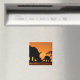 Una silueta de una madre rinoceronte y su bebida de ternera del agujero de agua local mientras el sol se pone detrás de ellos. Arte por computadora de Kathie Miller