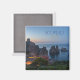 Imán fotográfico de recuerdo con las grandes rocas de Faraglioni en el agua del mar Mediterráneo y el viejo Tonnara rojo, fábrica de atún en Scopello, en la costa norte de Sicilia, Italia, en la Hora Azul del atardecer con el texto "Scopello, Sicilia".