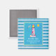 Un imán de agradecimiento personalizado con un tema náutico. Diseñado con un patrón de rayas azules y un marco azul con un borde amarillo sobre la parte superior. Un faro de rayas rojas y una bola de playa, un sol sonriente y una gaviota voladora a lo lejos colocada dentro del marco.