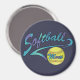 Baloncesto azul y púrpura de bola suave de mamá diseño con cola atlética y la palabra mamá situada en un softball óptico amarillo.