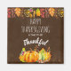 Un imán que dice: Feliz Día de Acción de Gracias un tiempo para estar agradecido. Un ilustracion acuático de calabazas, bellotas, setas y hojas de otoño de temporada. Un borde a lo largo de la parte superior también compuesto de hojas de otoño, bayas, bellotas y otros follajes.