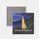 ¡Tú o alguien que conoces se está graduando! ¡Sí! Envía tus felicitaciones con nuestro elegante diseño con nuestro arte original de un gorro de graduación azul con una tassel amarillo contra un fondo negro texturado y la palabra, Felicitaciones en el fondo. Hay diseños personalizados disponibles.