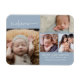 Anuncie la llegada de su bebé recién nacido con este imán de anuncio de nacimiento moderno de color azul polvoriento. La parte delantera presenta un collage de cuatro fotos de sus fotos favoritas de bebé con bienvenida en una tipografía de escritura. Personalice con el nombre de su bebé, fecha de nacimiento, estadísticas de nacimiento y nombres de los padres.