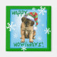 Celebra la temporada de fiestas con un adorable cachorro Leonberger usando un gorra lleno de nieve entre copos de nieve y las palabras, ¡Feliz Día de Amanecer! Gran idea de regalo de vacaciones para la familia y amigos amantes de Leo.