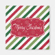 Feliz ilustracion navideño con texto y diseño de copos de nieve sobre fondo rayado rojo, blanco y verde