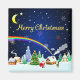 Hermosos paisajes de nieve con árboles de Navidad, casas, un hombre de nieve, y un arcoiris sobre la nieve que cae del cielo. Papá Noel y un reno caminando juntos para distribuir regalos de Navidad en la noche de los Navidades.