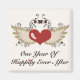 Un corazón alado en cálidos tonos rojos y neutros al hacer coincidir sus regalos de boda y su primer aniversario, papel, tarjetas de felicitación y ropa con las palabras Un año de felicidad para siempre después. Celebra tu primer año de matrimonio junto con estos regalos de primer aniversario tan lindos y de moda para ti y tu esposa.