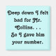 Para los amantes de la inolvidable novela "Orgullo y prejuicio" de Jane Austen, un chiste divertido sobre el pobre pretendiente rechazado de Lizzie Bennet, el señor Collins. Bueno, si no terminó con Charlotte, ¡podría haber terminado contigo! Este diseño presenta la cita "En lo profundo me sentí mal por el Sr. Collins. ... Así que le di tu número" con un hermoso fondo azul. ¡Perfecto diversión para sus compañeros fans de Austen!
