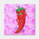 Un personaje de dibujos animados de pimiento rojo y picante. Diseño original con patrón de encaje rosa en el fondo.