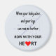 El remo exige aptitud física y agallas. Cuando tus piernas se rindan, ¡llévate el corazón! Pon este imán en tu refrigerador como una buena manera de entrenar tu mente subconsciente. El texto motivacional está en negro con un corazón rojo, y hay un fondo azul pálido con la silueta de una carrera de ocho.