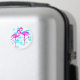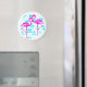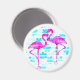 Imán tropical con dos flamencos rosados frente a un fondo floral azul. Personalizar con el texto que desee.