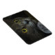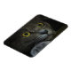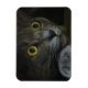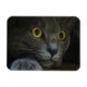 Un primer plano de la cara de un gato gris con ojos amarillos y pupilas dilatadas, apoyándose en su pata y mirando con atención algo detrás de la cámara.