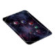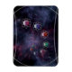 Un ilustracion de infinito, cruzando el universo para combinar el microscópico y el telescópico en una muestra de formas y colores arcoiris. Columna de átomos multicolores de azul, rosa, rojo y verde rodeados de anillos de plata que atraviesan el espacio exterior en espiral contra un fondo de galaxias fractales coloridas.