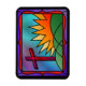 Un diseño de vidrieras que ilustra la mañana de Pascua, con una cruz roja parada en las verdes colinas junto a un ardiente amanecer.