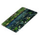 Escena submarina dividida con un valle verde por encima y las profundidades frías de un río montañoso rocoso por debajo. Los rayos solares bailan a través del agua y los bancos de peces plateados nadan entre las piedras y las malezas del lecho del río.