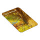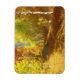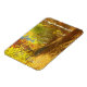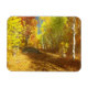 Un camino sobrepoblado serpentea por el bosque de abedules en un día soleado de otoño. Los troncos blancos y negros de los árboles contrastan con las hojas y el césped en todos los tonos de oro, desde el amarillo pálido hasta el naranja profundo, iluminados por los rayos solares que recorren las ramas.