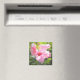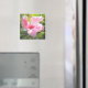 La fotografía original de MaeFlowers en este Magnet presenta una flor de hibisco rosa a la luz del sol matutino con un fondo de hojas verdes. Uno de los pétalos florales, todavía a la sombra, tiene gotitas de lluvia en ella desde una ducha de madrugada. Los tonos rosas y verdes crean un agradable ambiente de jardín.